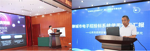 随后山东东岳项目管理有限公司招标业务部邵光部长和江苏国泰新点软件的讲师陈巍分别做了《聊城市电子招投标系统使用情况》、《互联网+大数据网上招投标》主题讲座。